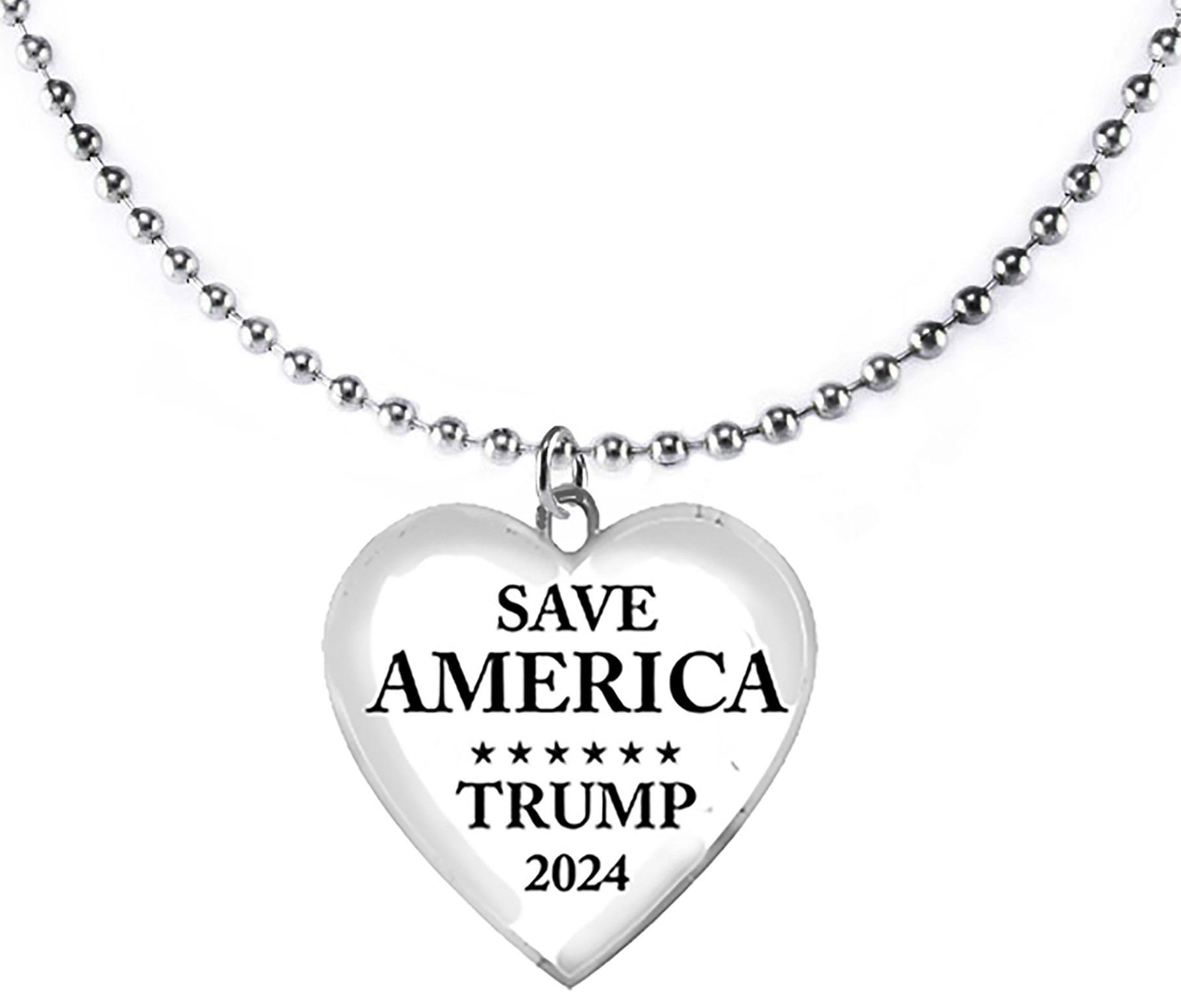 SAVE AMERICA Trump 2024, Heart Charm On A Ball Chain Necklacet. What A Wonderful Gift For Yourself, Or A Friend, Or A Family Member, Or As A Donor Gift. Hypoallergenic-Safe, No Nickel, Lead, Or Cadmium In The Metal.©2022